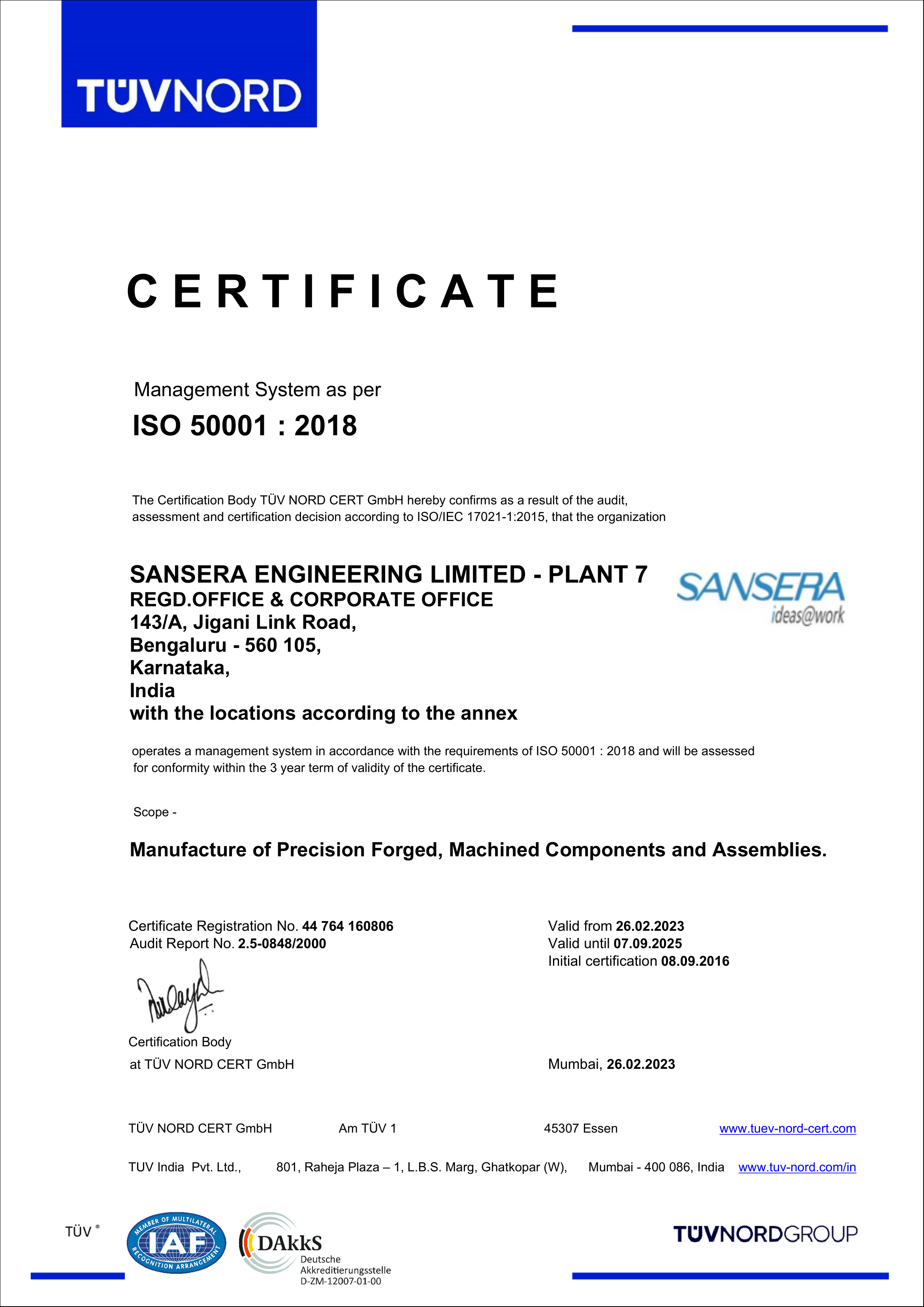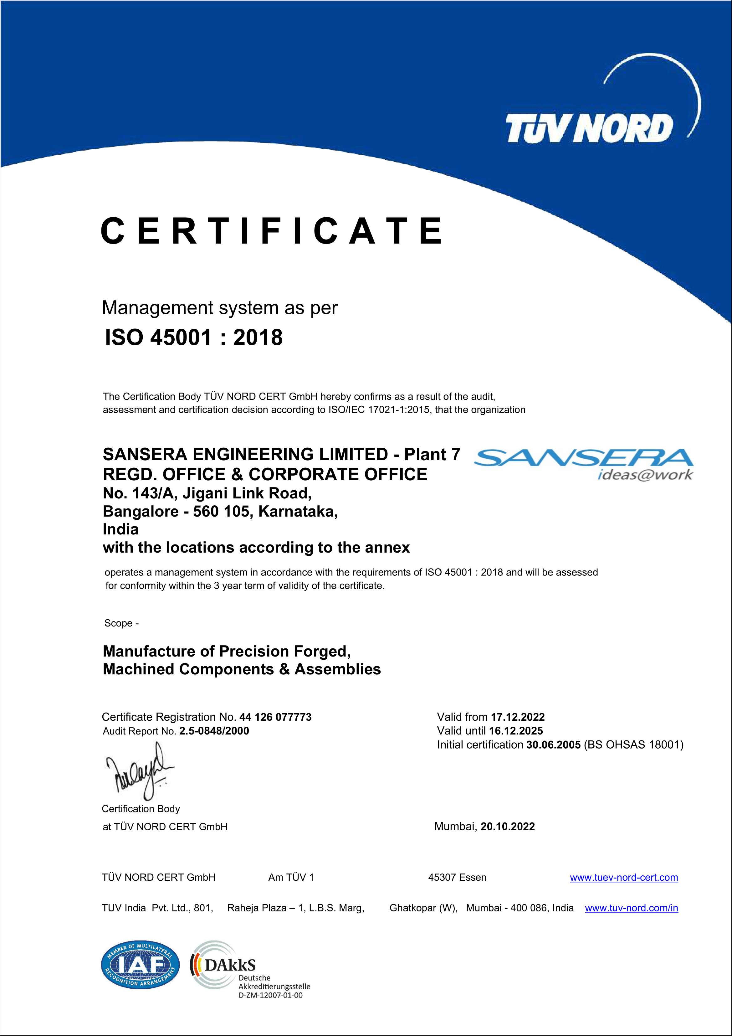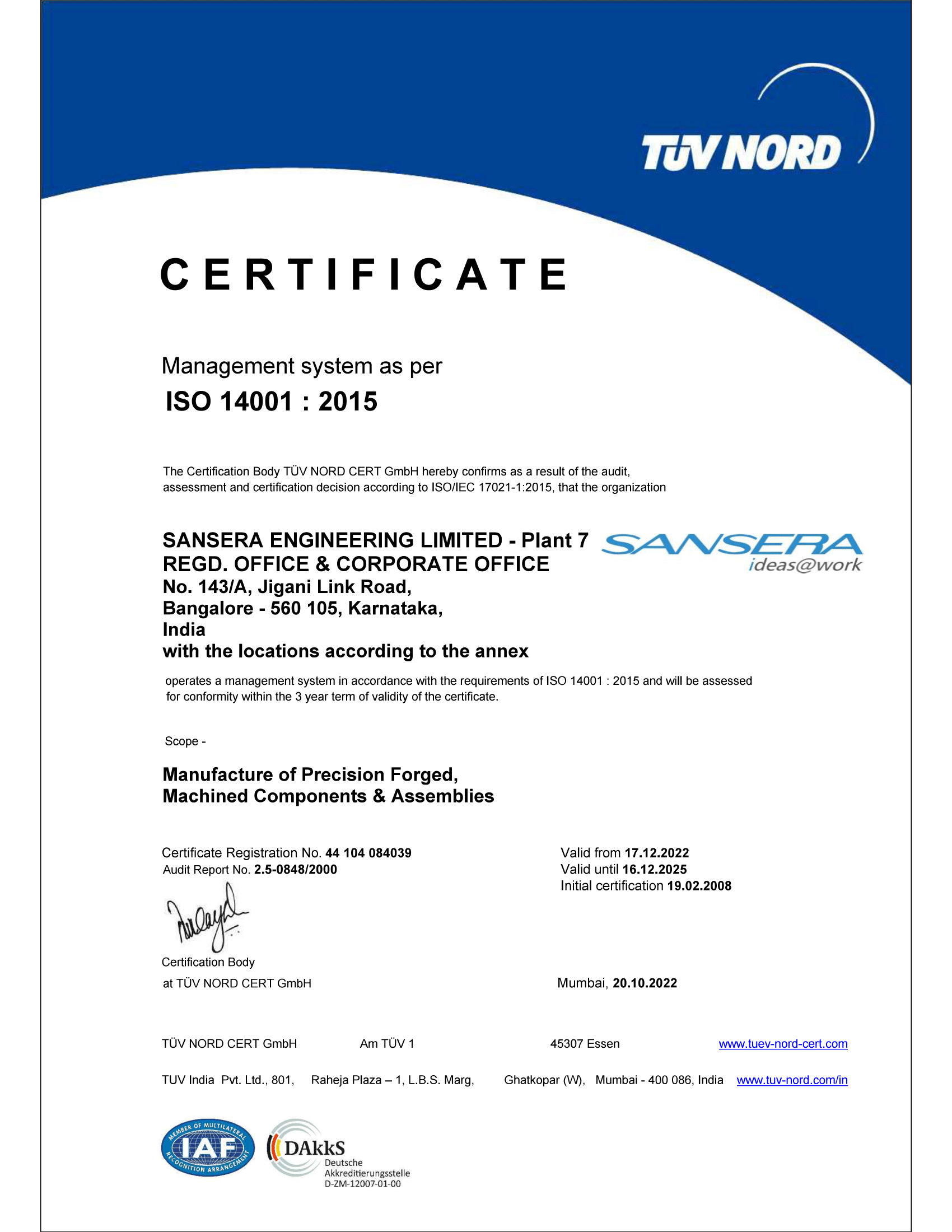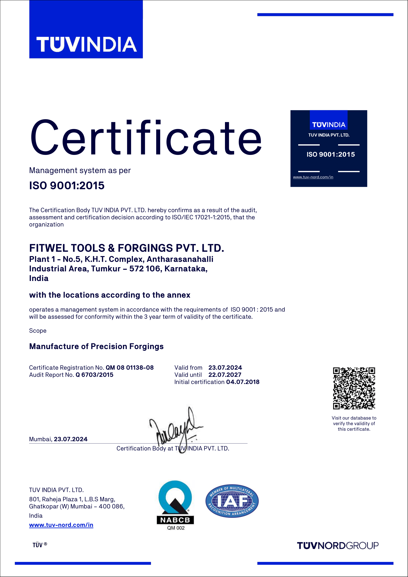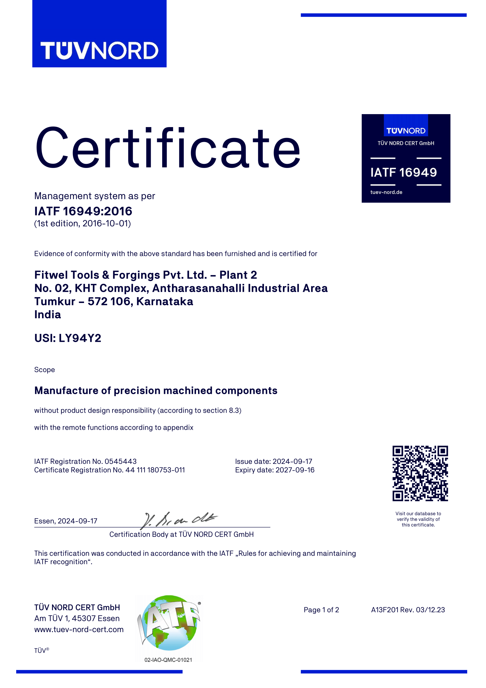 M/S Fitwel Tools and Forgings Pvt. Ltd. was ISO/TS 16949:2009 certified in the year 2002 and has been ISO 14001:2004 certified in the year 2014. Fitwel became a Subsidiary of M/S Sansera Engineering Pvt. Ltd.In the year 2005.
